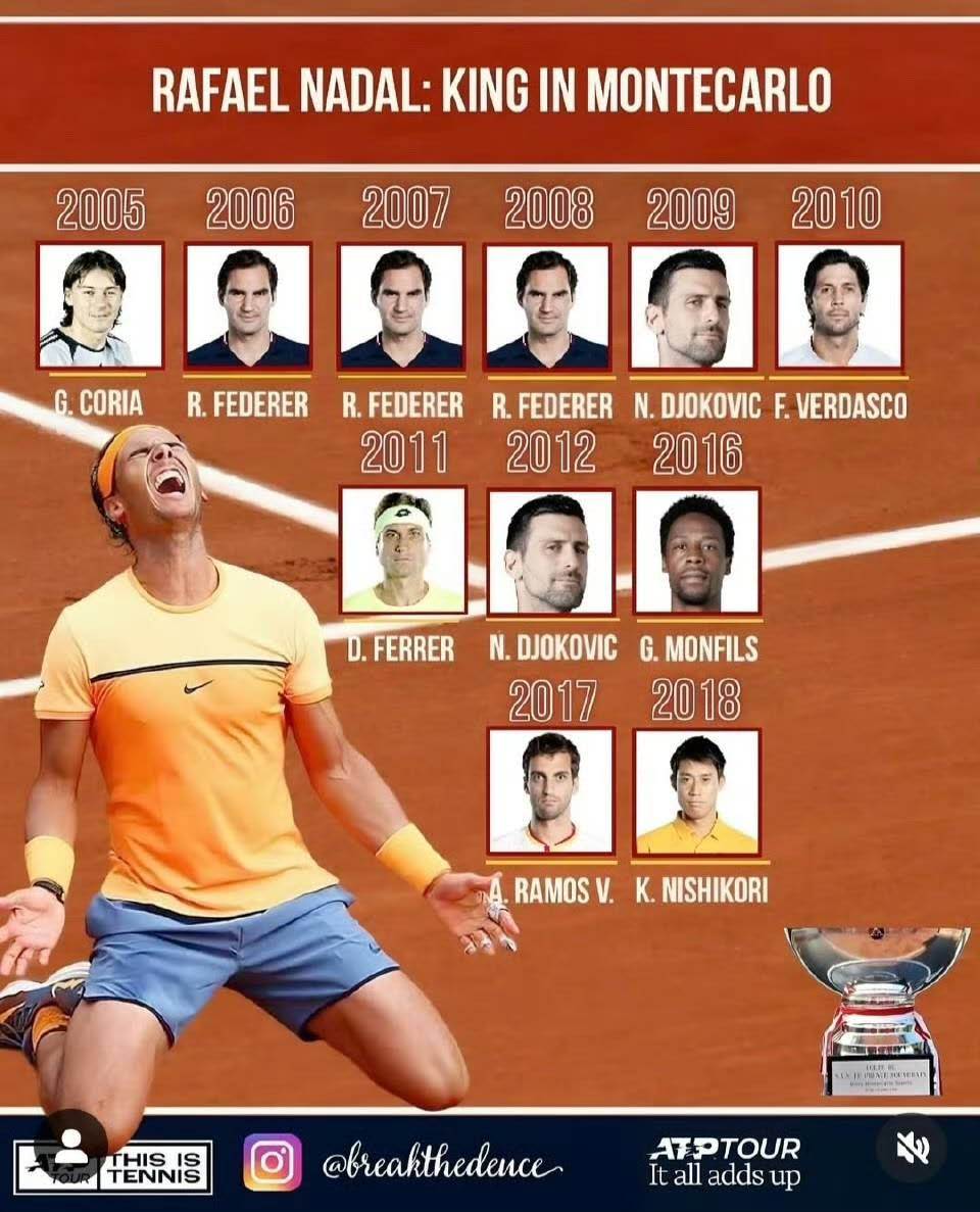 在蒙特卡洛,纳达尔以两盘一鸡蛋一油条的比分进入八强,后续三战均面对本国同胞,最终他连过费雷罗、费雷尔和沃达斯科夺冠,拿到局分最多的费雷罗也不过六局而已。